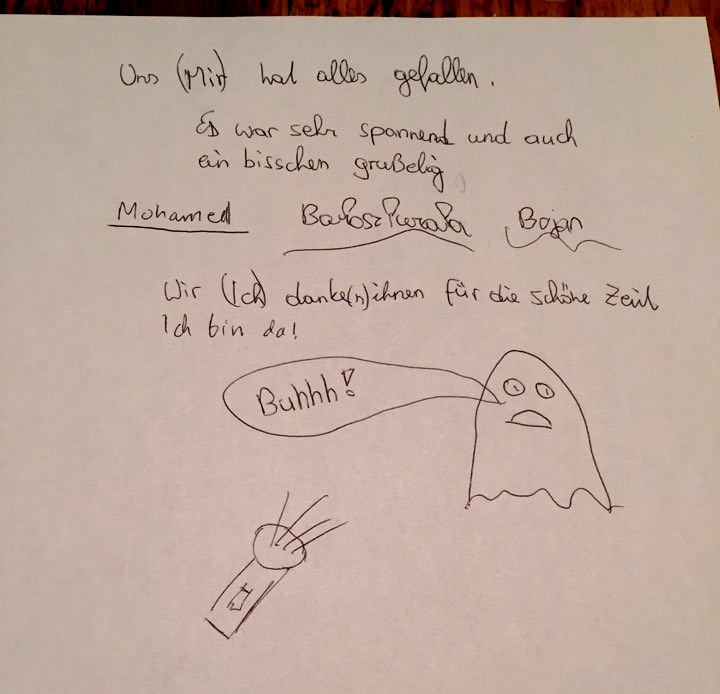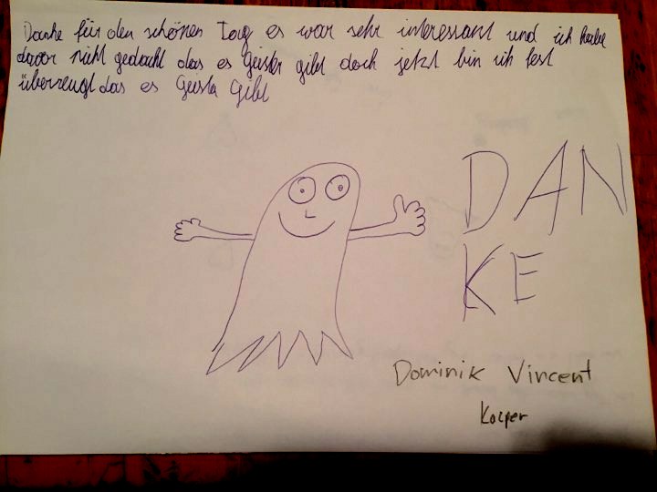 Am Ende des Workshops, wurde noch ein Schlusresumee abgehalten, wobei sich interessanter Weise herausstellte, dass zum Unterschied des Tagesanfanges; wo kaum eines der Kinder an Geister glaubte; plötzlich die Meinungen abdrifteten und mehr als 70% der Kids davon überzeugt waren, dass es Geister gibt. Dies jedoch nicht in einem furchteinflössenden Rahmen.