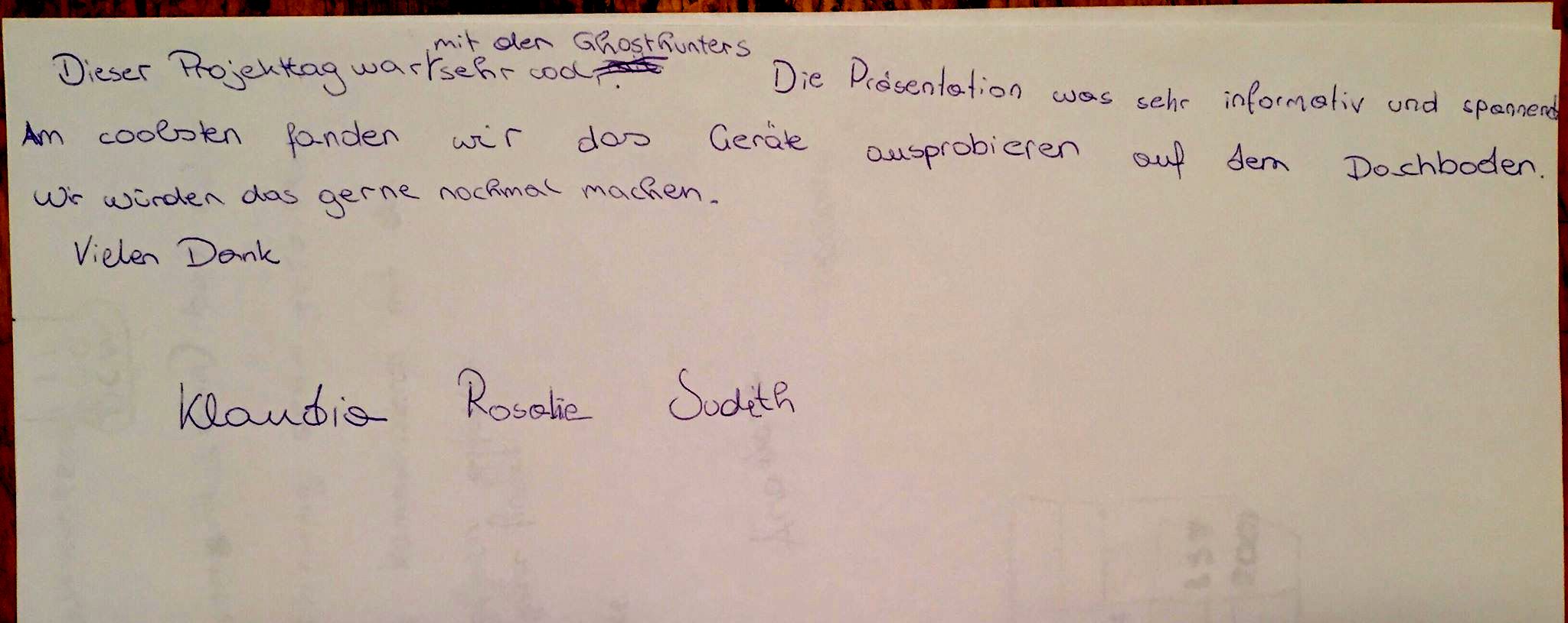 Am ersten Tag der beiden Projekttage wurden die Kinder angehalten, den Ghosthunters ein Feedback zu geben, wovon die Geisterjäger selbst nichts wussten und welches sie am Folgetag voller Ffreude erhielten.